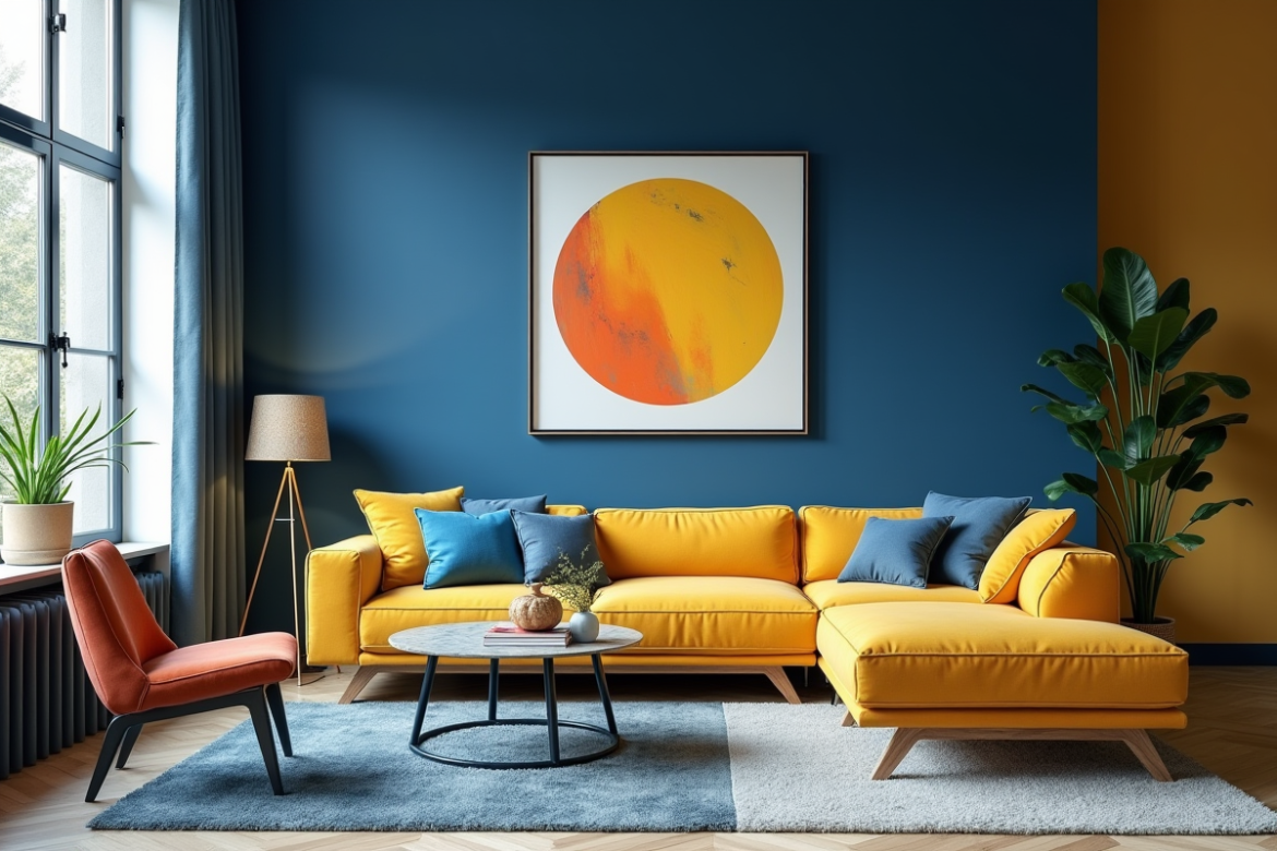 - Jaune moutarde et bleu profond : L’énergie du jaune moutarde se marie parfaitement avec la sophistication du bleu profond. Cette combinaison dynamise l’espace tout en restant élégante.