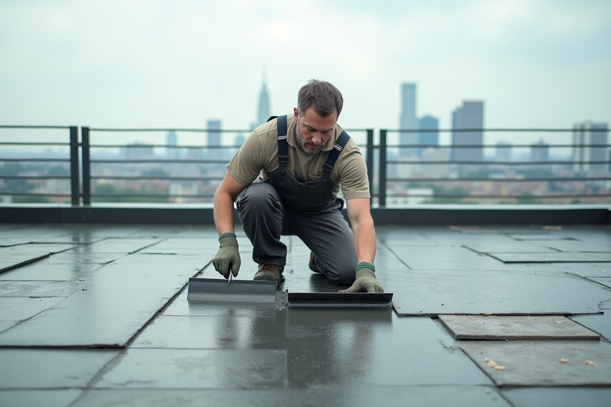 Ouvrier en overalls appliquant du bitume sur un toit urbain