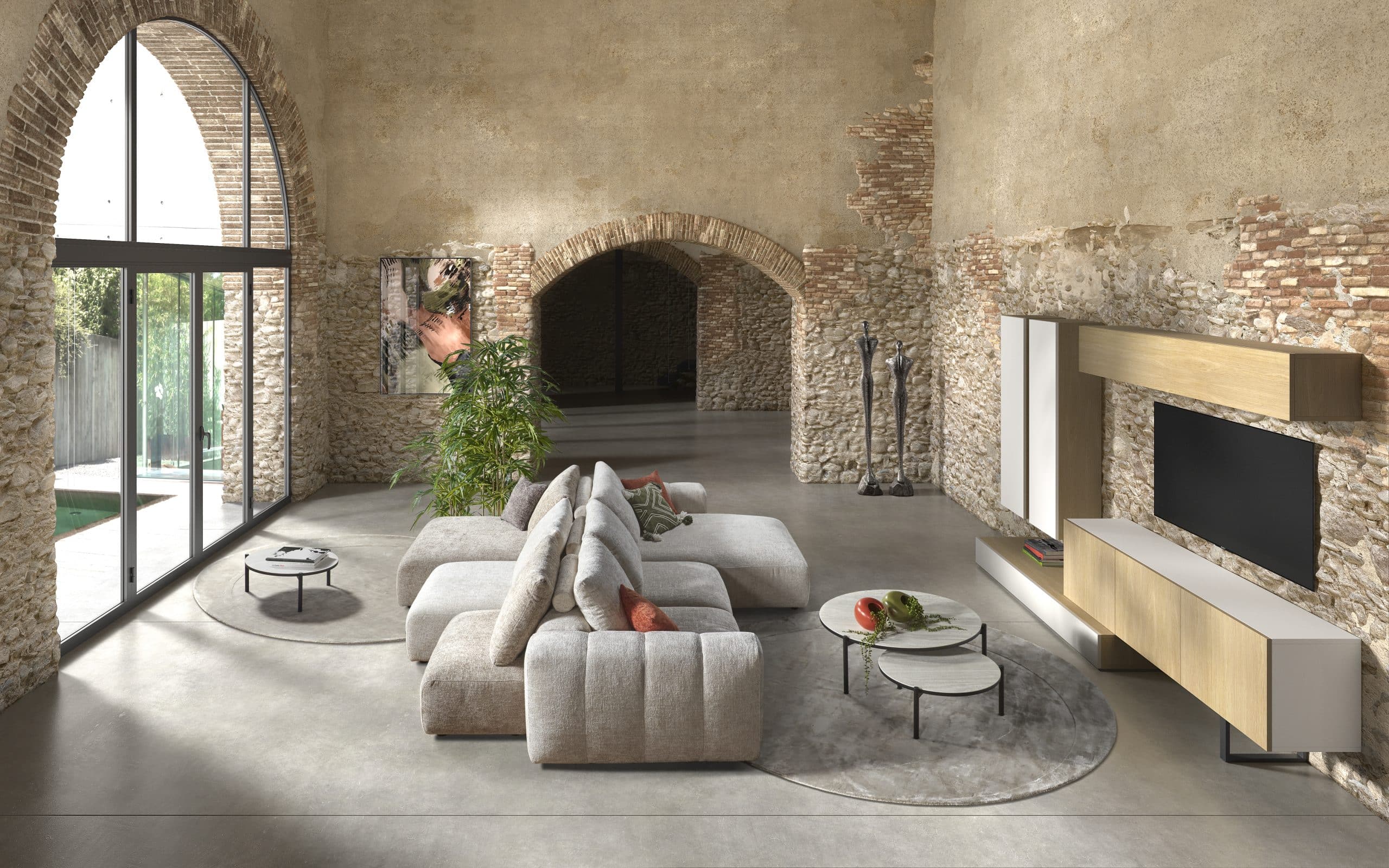 Tapis Rotonde. Exclusivité XXL Maison : présenté en kaki, existe en 4 couleurs et plusieurs tailles. A partir de 419€ TTC en taille 160*235 cm ; Lampe Onda. Hauteur 150 et 190 cm – pied métal noir, abat-jour en coton. Coloris brique et menthe. A partir de 799€ TTC version 150 cm 849€ TTC version 190 cm ; Table basse Defiaa. L.100 x H.28 x P.100 cm – Piétement : fer coloré, plateau : MDF placage bois et verre teinté. Prix sur demande, selon option et configuration.